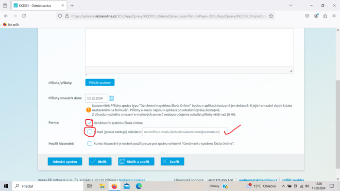 Pokud chcete, aby Vámi vytvořená zpráva v systému Škola online byl doručena dané osobě také na e-mail, musíte zatrhnout tuto možnost v systému (viz obrázek níže). Takto se zpráva odešle do systému i na e-mail.