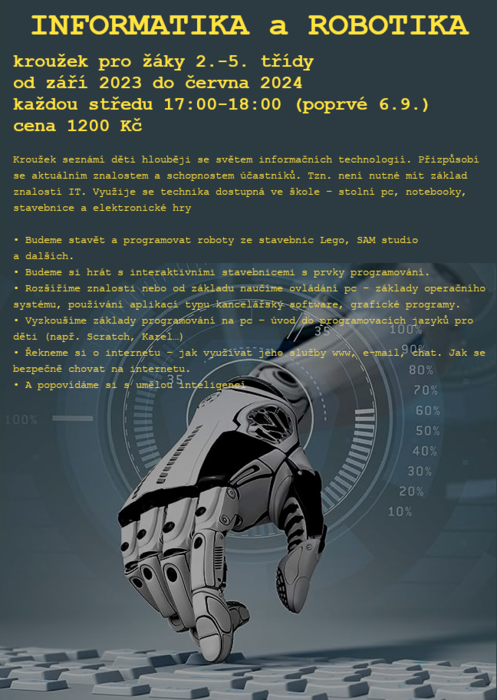 Nově se bude na naší škole cvičit Jóga a přibude kroužek Informatiky a robotiky. Podrobnosti v přílohách.